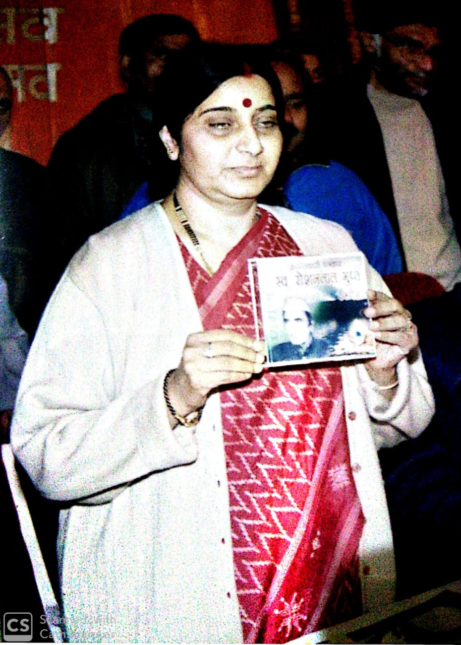पत्रकार आदर्श नन्दन गुप्ता ने 2004 की उनकी आगरा यात्रा को याद करते हुए बताया कि सुषमा स्वराज ने स्वाधीनता संग्राम सेनानी व हार्डी बम कांड के क्रांतिकारी स्व, रोशनलाल गुप्त करुणेश के क्रांतिकारी जीवन पर आधारित सीडी का लोकार्पण किया था। मून टीवी नेटवर्क द्वारा तैयार की गई इस सीडी की उन्होंने तारीफ की और करुणेश जी को नमन करते हुए श्रद्धांजलि दी थी।